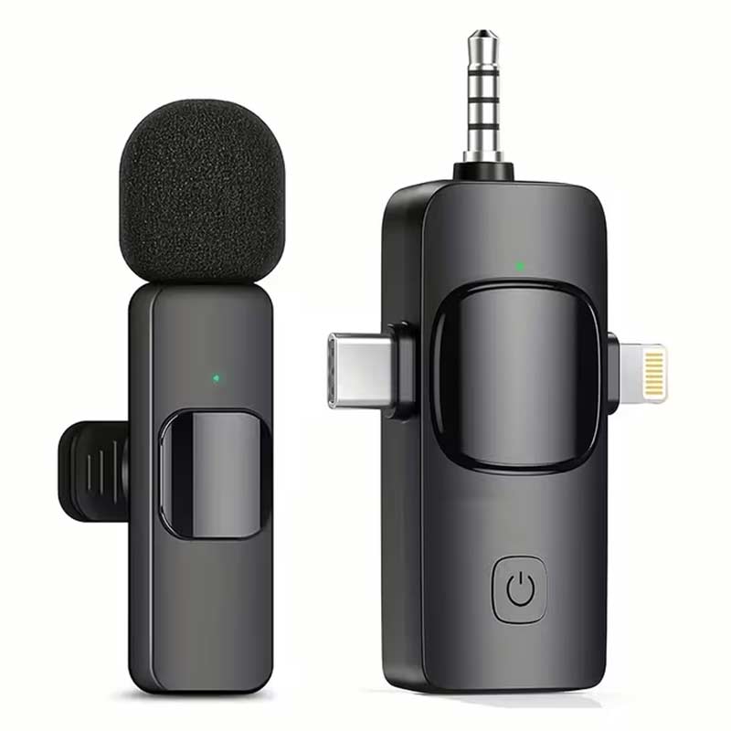 Безжичен микрофон со штипка – Lavalier – 3 во 1 е компактен и лесен за употреба, обезбедувајќи јасен звук за аудио и видео снимање.